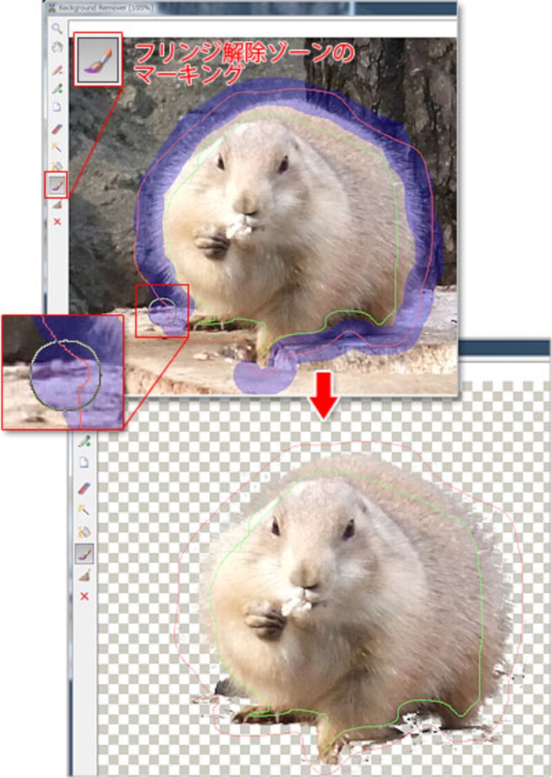| 「フリンジ解除ゾーンのマーキング」ツールで塗った部分の背景が削除された状態です。 |