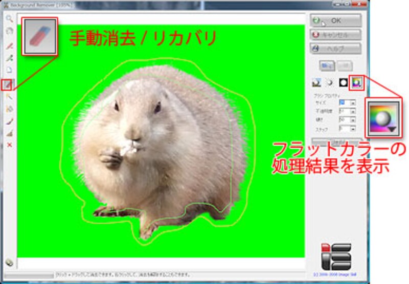 | 「フラットカラーの処理結果を表示」で背景を黄緑色の塗りで表示させて、「手動消去/リカバリ」ツールで消し残り、消しすぎ部分を調整しています。 |