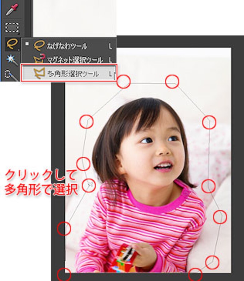 まず子供の写真を選択します。ツールボックスの「多角形選択ツール」で、子供の輪郭の外側をクリックして、おおまかに直線で選択していきます。