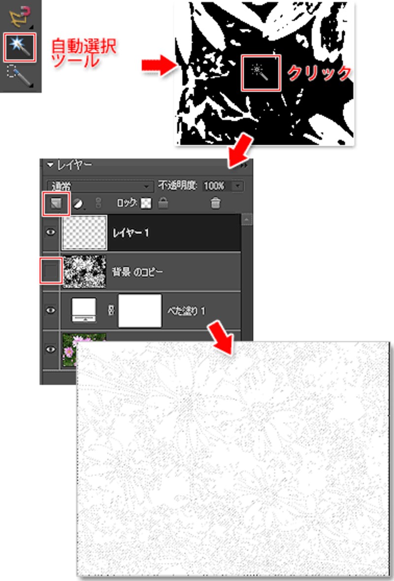 白黒の線画の黒い部分を選択します。[自動選択ツール]を選び、[黒]の部分をクリックします。黒い部分が選択されます。