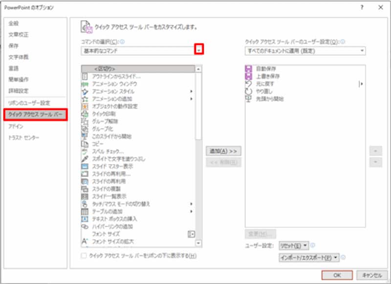 よく使う機能を登録するには、クイックアクセスツールバー右端の▼をクリックし、表示されるメニューから「その他のコマンド」をクリックします。 「PowerPointのオプション」ダイアログボックスが表示されたら、左側の「クイックアクセスツールバー」が選ばれていることを確認し、「コマンドの選択」の「基本的なコマンド」の▼をクリックして。「すべてのコマンド」をクリックします。 これで、PowerPoint(パワーポイント)のすべての機能が一覧表示されます。クイックアクセスツールバーに登録したい機能をクリックして、中央の「追加」ボタンをクリックします。 追加した機能が右側に表示されたら「OK」ボタンをクリックします。 これで、選択した機能がクイックアクセスツールバーに登録されました。