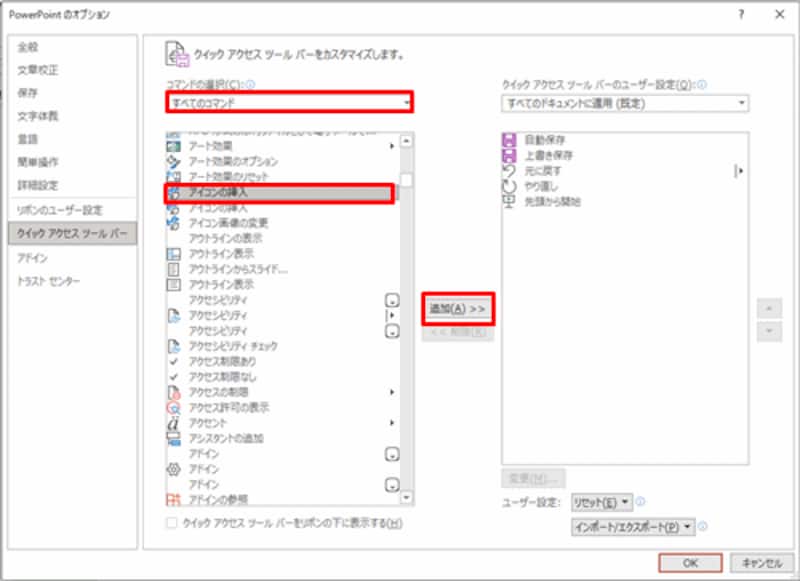 PowerPoint(パワーポイント)に最初から用意されているショートカットキーはたくさんありますが、自分がよく使う機能がショートカットキーとして登録されていない場合があります。例えば、スライドにイラストを挿入する「アイコン」機能はショートカットキーがありません。よく使う機能をすばやく実行するには、画面左上の「クイックアクセスツールバー」に機能を登録します。