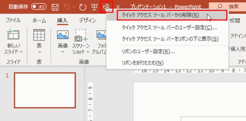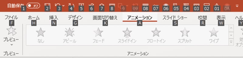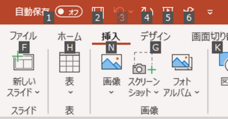 Microsoft 365のPowerPoint(パワーポイント)では、初期設定で「自動保存」「上書き保存」「元に戻す」「繰り返し」「先頭から開始」の5個がクイックアクセスツールバーに登録されているので、「Alt」+「1」キーを押すと「自動保存」が実行されるというわけです。