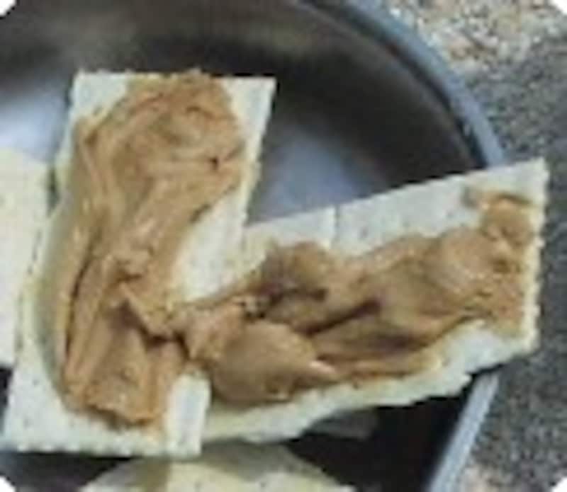 約10センチ四方の薄味のクラッカーが2枚。開封したときにはもうヒビが入っておりました。ピーナッツバターをたっぷり塗って食べると、口の中がモサモサして水分が欲しくなりました。(40g/180kcal)■PEANUT BUTTER(ピーナッツバター)