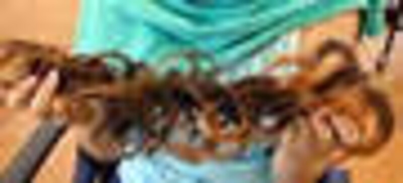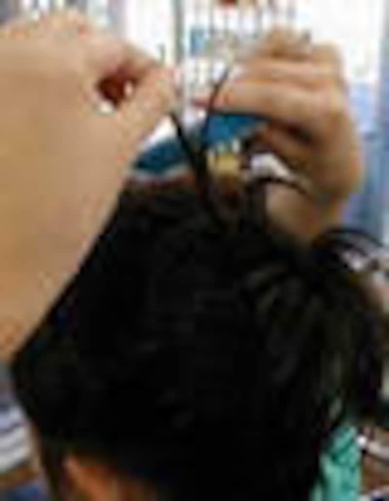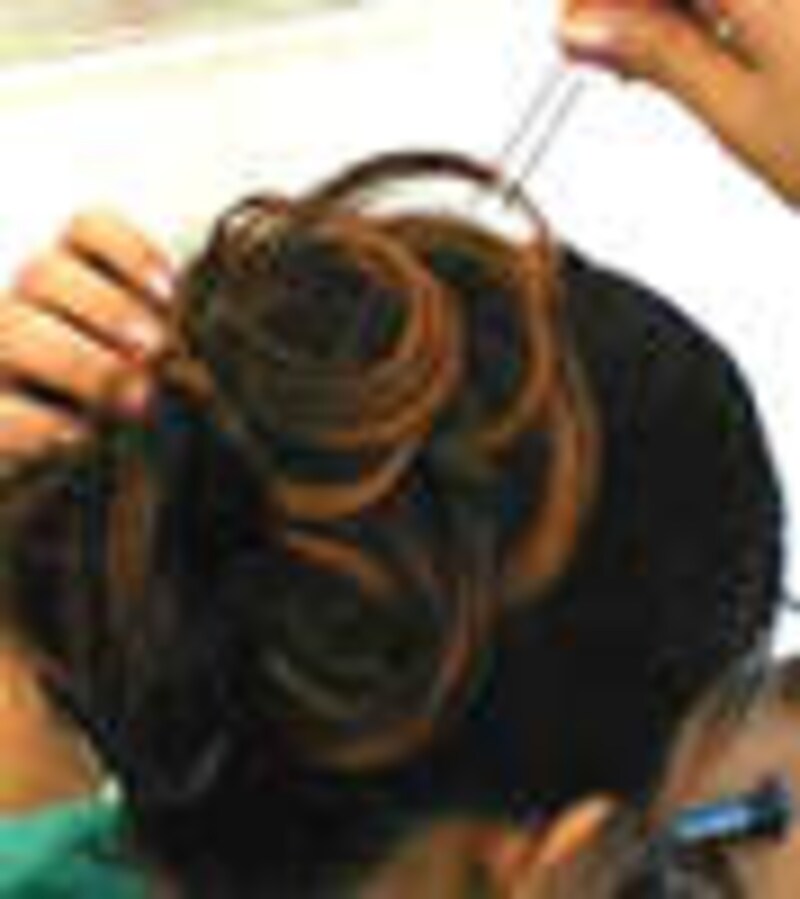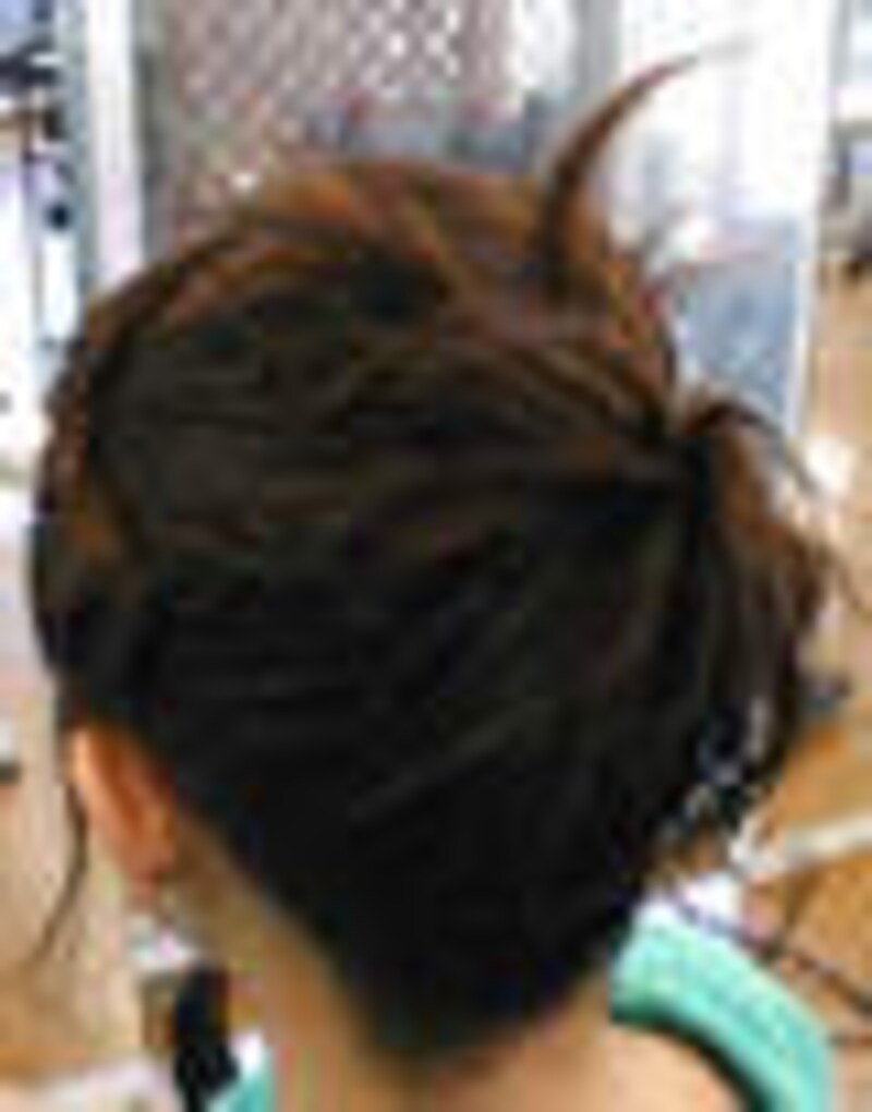 ◆・・・セミロングスタイル・・・◆ まずは今一番多いスタイル、セミロングから紹介していきましょう。 左はモデルさんの作業前のスタイルです。 まず、髪の毛を濡らしてください。 つぎに、耳の後ろからラインを取り前後に分けます。 後ろ半分を、ゴムでポニーテールに結びます。そのときに注意する事は、下にたるみが出来ないように少し上を向いた状態で留めることです。 残った前側部分を編み込みます。 (出来ない方は三つ編みでもOK)、 ポニーテール部分にユーピンで留めます。 ポニーテール部分の毛先に逆毛を立て、小分けにします。上下左右にばらしながら、小分けにした毛束をユーピンで固定させていきます。 はい、出来あがり! 基本パターンだけ覚えておけば、これ以外にもパターンを変えることによってバリエーションは広がります。 ・・・サイドツイストバージョン・・・ 前側に分けた髪を、くしの先で押さえてねじり上げます。くしを使うことで、しっかりとしたねじりを作ってトップをユーピンで留めます。 ・・・つけ毛を使用したバージョン・・・ つけ毛をほぐして形を整え、ポニーテール部分に留めます。ほどよくばらして出来上がり!つけ毛は、簡単に華やかなアップスタイルを作れるのでオススメです。 前のページへ123次のページへ