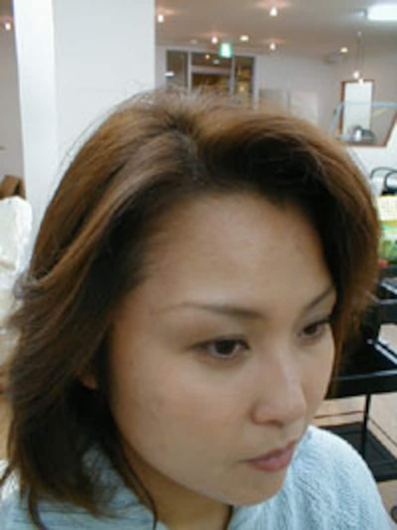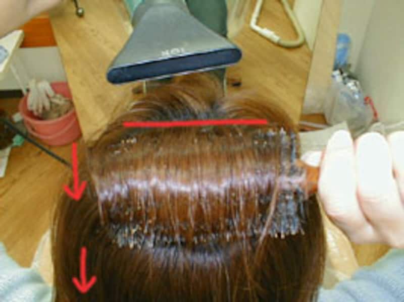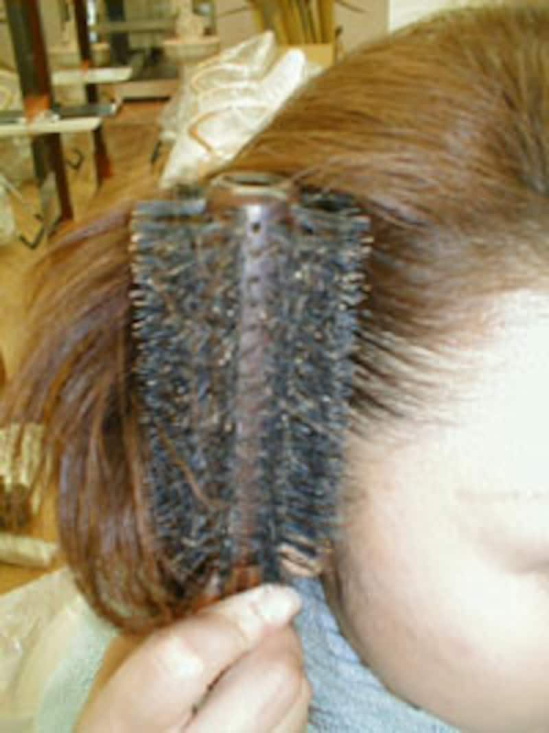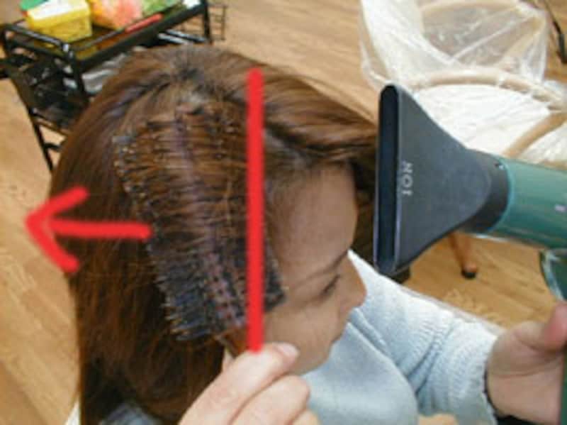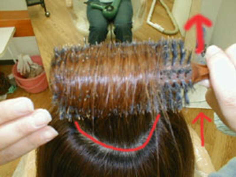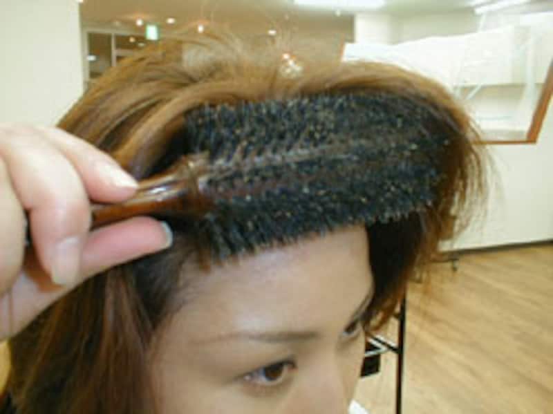 根元に写真のように下から押し上げる様にブラシを当て、立ち上げていくテクニックです。この場合根元だけ立ち上がるスタイルになります。