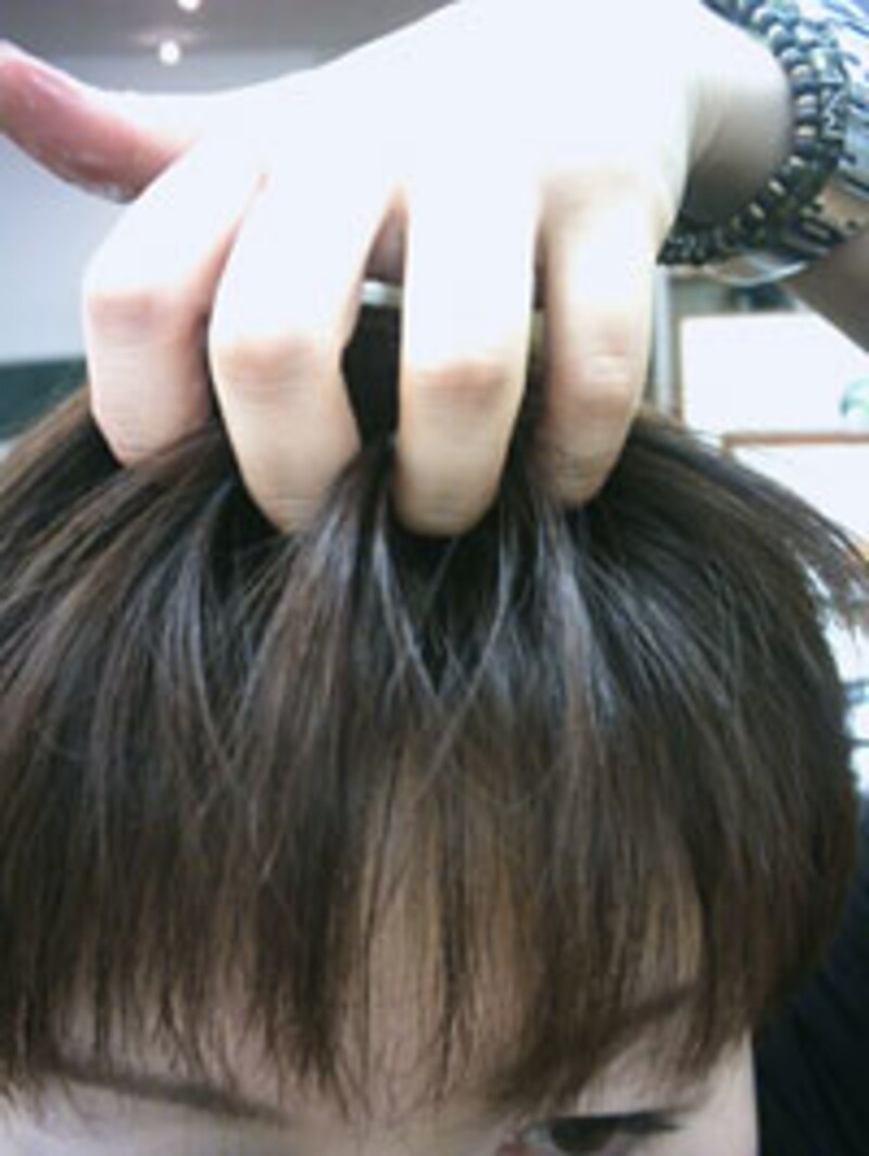 今回は、このムースを使ってポイントメイクをしていきます。まず手に取ったムースを反対側の手の指先に取ります。そして写真のように毛束を持ち上げ指先に付いたムースを立ち上げる根元に塗布します。 横から見ると、このようになります。指先の毛束を持ち上げる様にするとボリュームが出ます。そして、それとは逆に上からかぶせる様にムースを付けるとボリュームダウンが可能になっていきます。ご自身のボリュームを持ち上げる角度で調整して下さい。