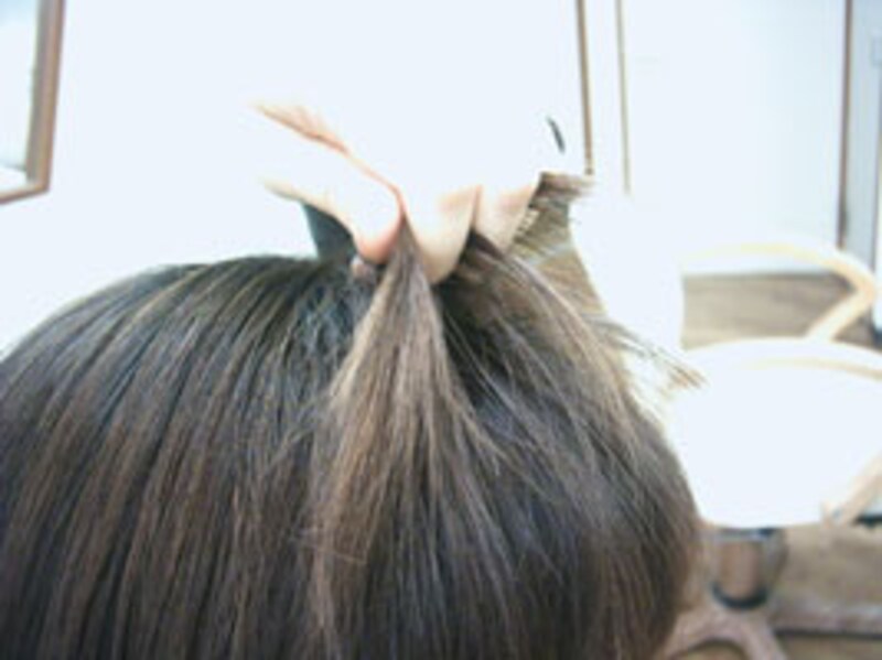 ムースの特徴として、まず上げられるのが「つけむら」が少ないと言う点。広範囲にスタイリングしたい場合やウエーブヘア等、全体的にボリュームが欲しいスタイルには、やっぱりムースが最適ですね。(ココであげるムースは、いわゆるセット力のあるムースです) 今回は、このムースを使ってポイントメイクをしていきます。まず手に取ったムースを反対側の手の指先に取ります。そして写真のように毛束を持ち上げ指先に付いたムースを立ち上げる根元に塗布します。