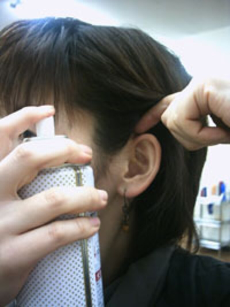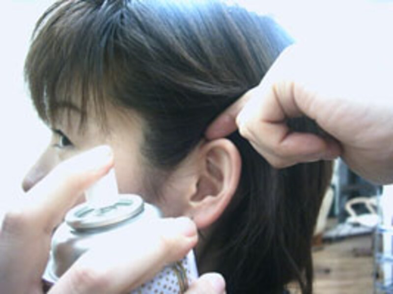 ここでは、写真のようにサイドの立ち上がりを出す方法で使用します。まず耳に髪を、かける場合と同じように指を耳の下から上へと滑らせる様に入れていきます。そして指の先端部分を、めがけスプレーを噴射していきます。