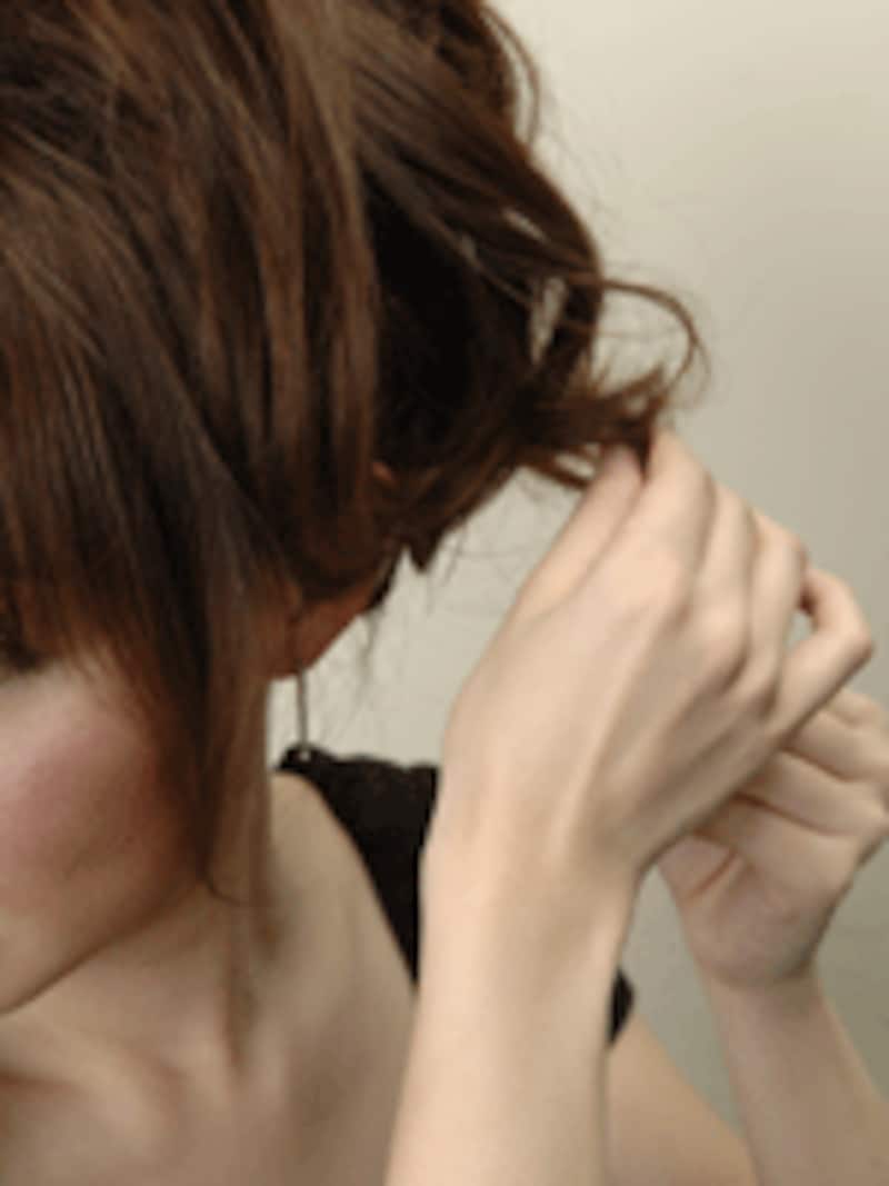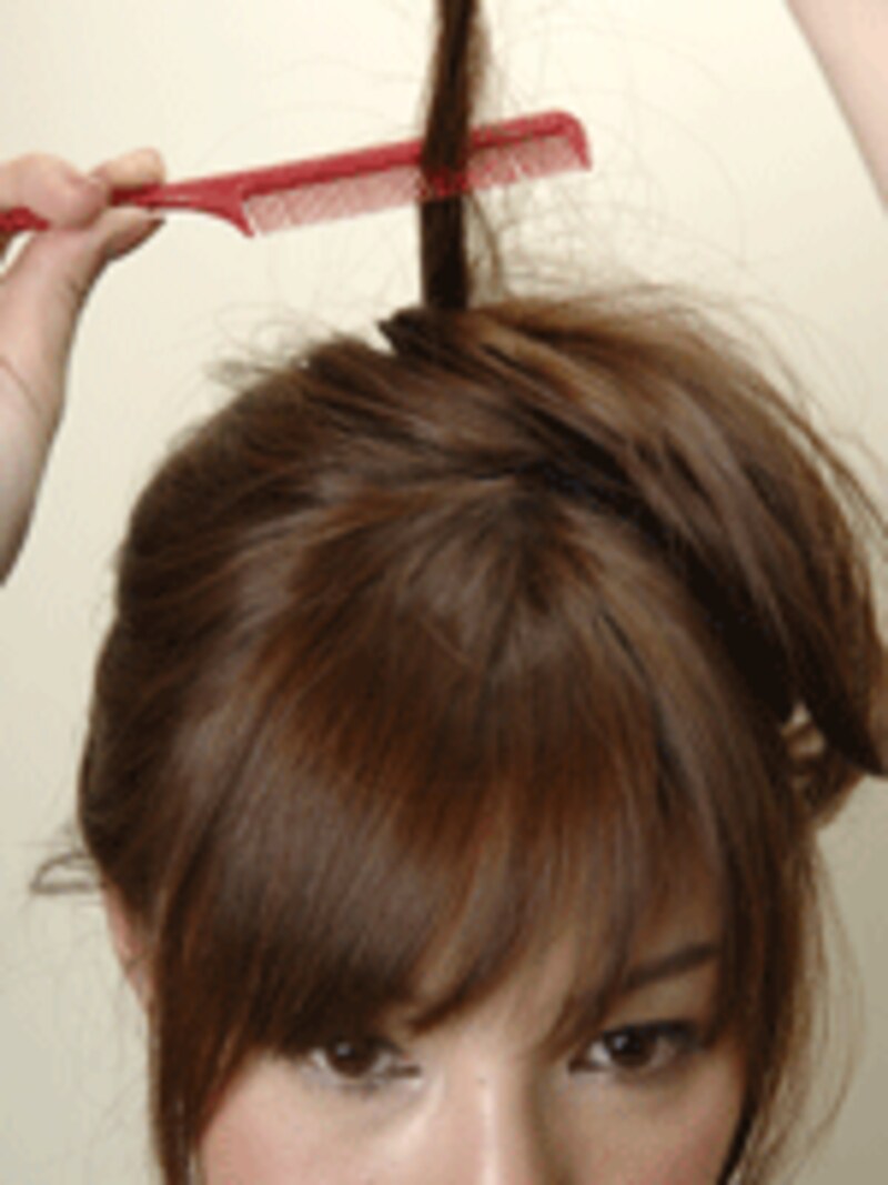 毛先のボリュームをアップさせるため、毛束を少しとり下に向かってとかすように逆毛を作ります。また、指でほぐしたりします。少ない毛束を丁寧にほぐしてあげるのがポイントです。
