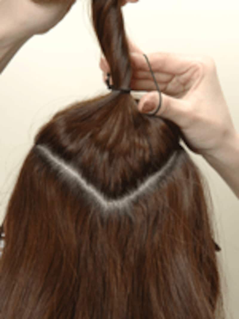 後ろ半分の毛を使って土台となるベースを作ります。頭のてっぺんを中心にVの字に髪を分けとります。結び目はつむじの上あたりの高い位置で作ると華やかさが増し、きれいに仕上がります。