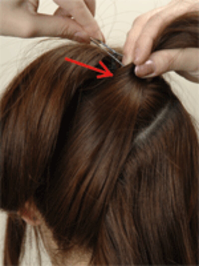 後ろの土台以外の残った毛は、左右で二つに分けます。まず左の毛束をとり土台に向かって引き上げ、土台の結び目の右横でねじって留めます。右側の毛束も土台の左横でピンで留めます。