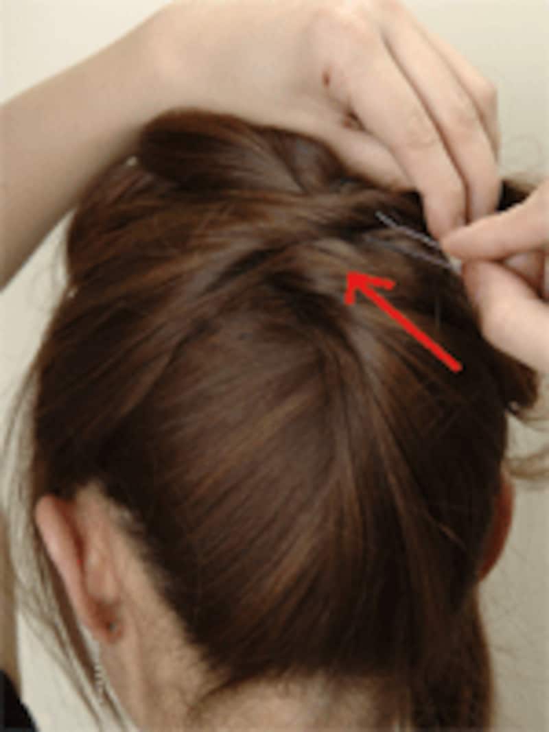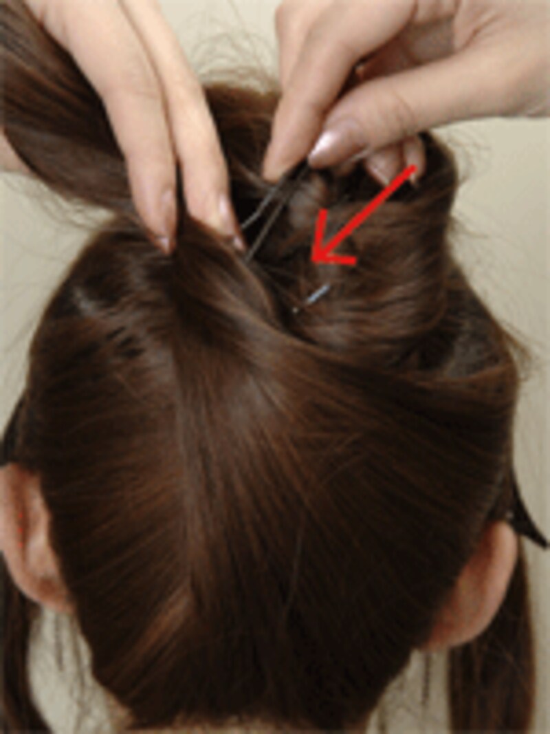 耳より前に残っていた毛束も同じように土台の結び目の横でねじって留めます。左右の毛を土台の中心の近くで留めると後でピンが隠れてすっきり見えますよ。