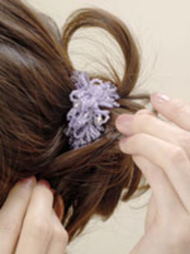 ゴムより先の毛先に動きが出るよう、数ヵ所ピンで留めます。ランダムにとったほうがより柔らかな質感が出てよいですね。