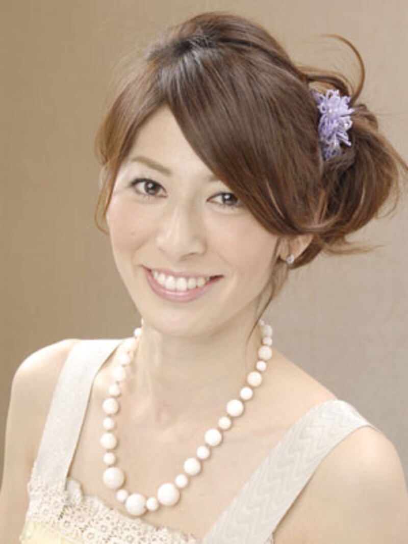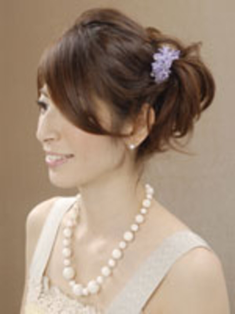 前髪を残してそのほかの毛を、左耳の上あたりでひとつにまとめ飾りゴムで縛ります。このときにえりあしがたるまないよう、しっかりまとめてから縛るのが成功の秘訣ですよ。