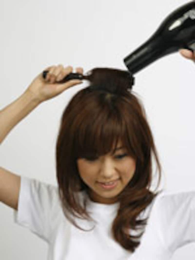 トップにふんわり感を出すために、ブラシとドライヤーを使って、トップをブローしていきます。ブラシで根元から髪を立ち上げるのがポイントです。