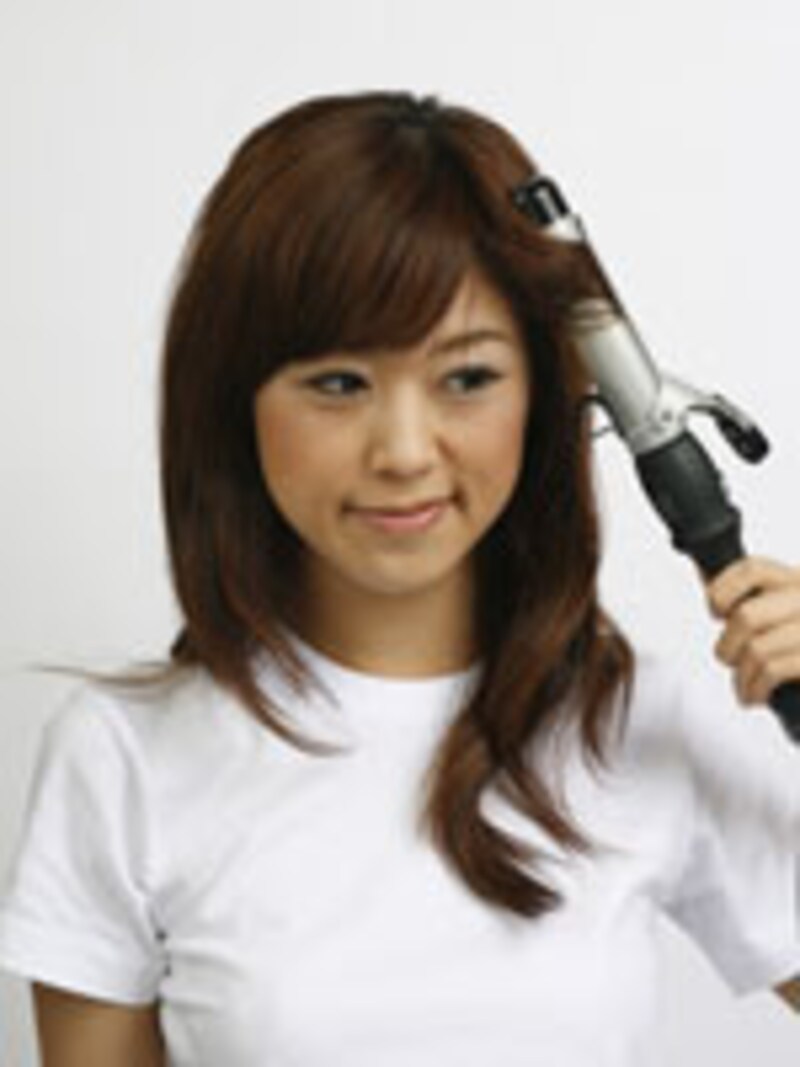 まずは毛先にクセ付け。コテを使って全体を内巻きに巻きます、ナチュラルなゆる巻きを作るのが成功のポイントですよ。