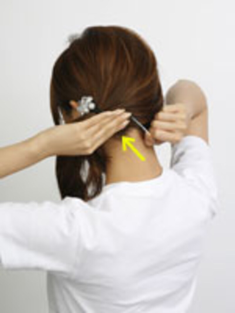 後れ毛をピンで留めます。後れ毛を隠すことで、結び目と反対側のサイドがよりスッキリしてくるので完成度が上がりますよ。