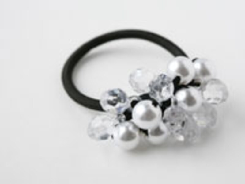今回使うのはオーソドックスな黒ゴムにパールの飾りがついたもの。すこし存在感があるくらいがロングヘアにはちょうどいいですね。