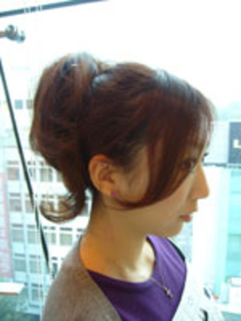 前髪を残して全体を1つにまとめ、つむじのあたりで輪ゴムで結びます。結び目に髪を一束巻きつけ結び目を隠すと完成度がアップ!毛先にボリュームを持たせると華やかさがアップしますよ!