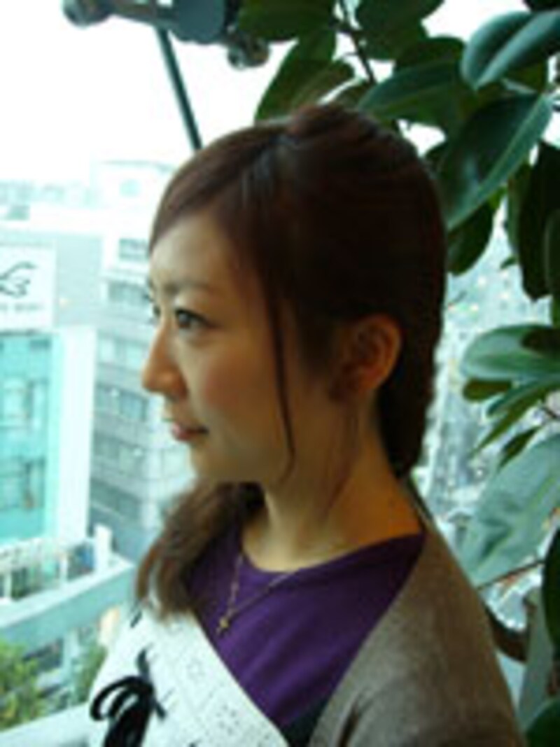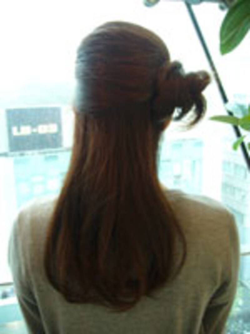| えりあしを残してトップを耳の付け根で1つにまとめクシュッとおだんごに。カジュアルでスッキリしたヘアアレンジです。 |