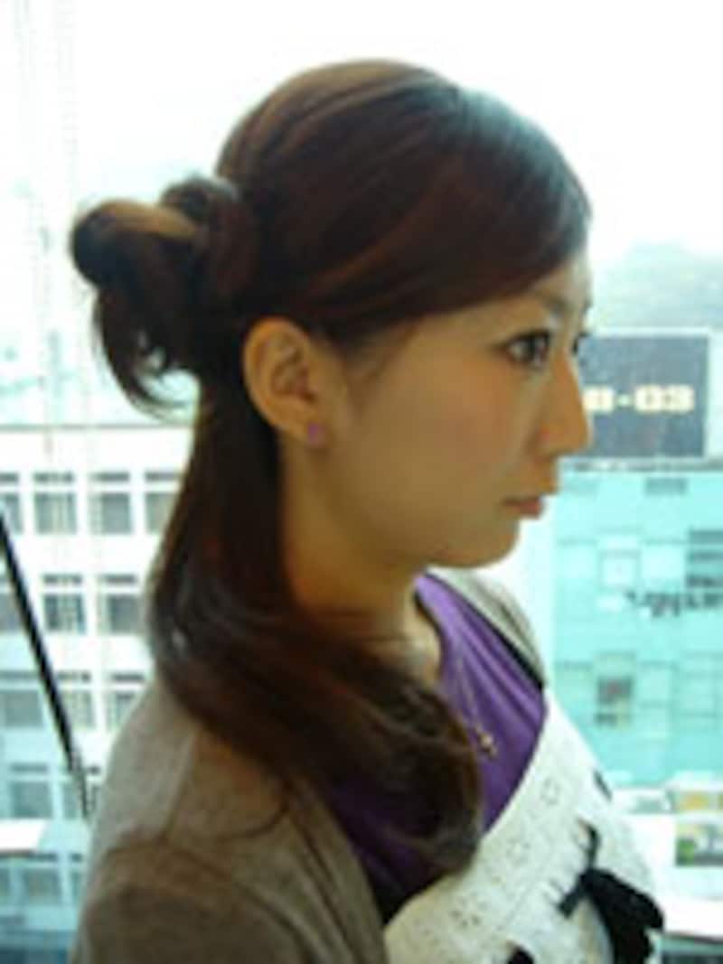 左右の耳の付け根を結んだラインで上下に分け、上の部分を耳の付け根で1つにまとめ輪ゴムで結びます。結び目に毛先をクシュッとねじりピンで留めてお団子を作ります。分け目から下の部分はそのままでOK。