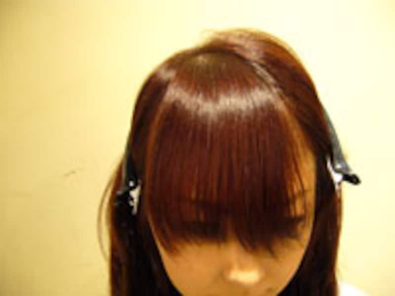 前髪が伸びきってしまってサイドに流すには長すぎですね。真ん中で分けるしかなくなっていますので、今回は2cmカットして目の上で流せる前髪をつってみたいと思います。