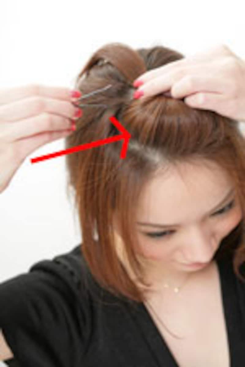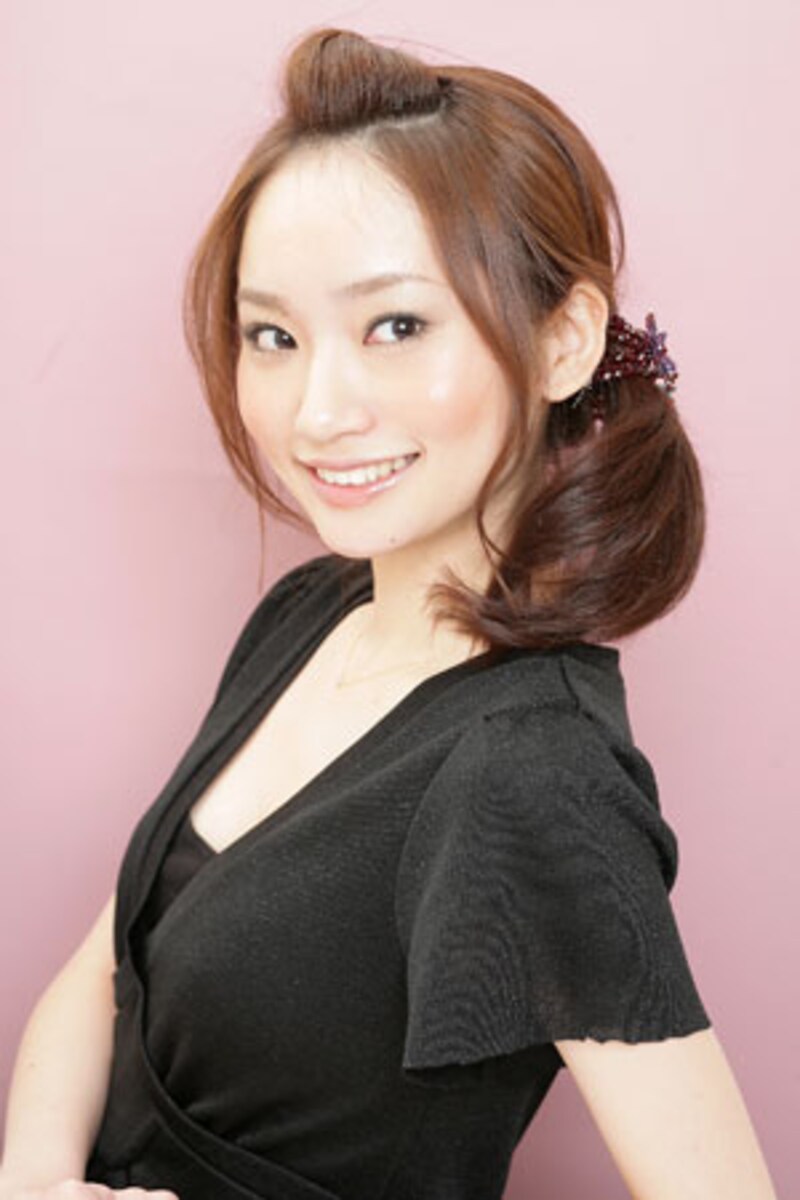 シンプルだけどアクセサリーにポイントを持たせた華やかなヘアアレンジですね。前髪をポンパドールにすることによって少しカジュアルな質感になってくるのでお洋服の幅が広がりそう!!
