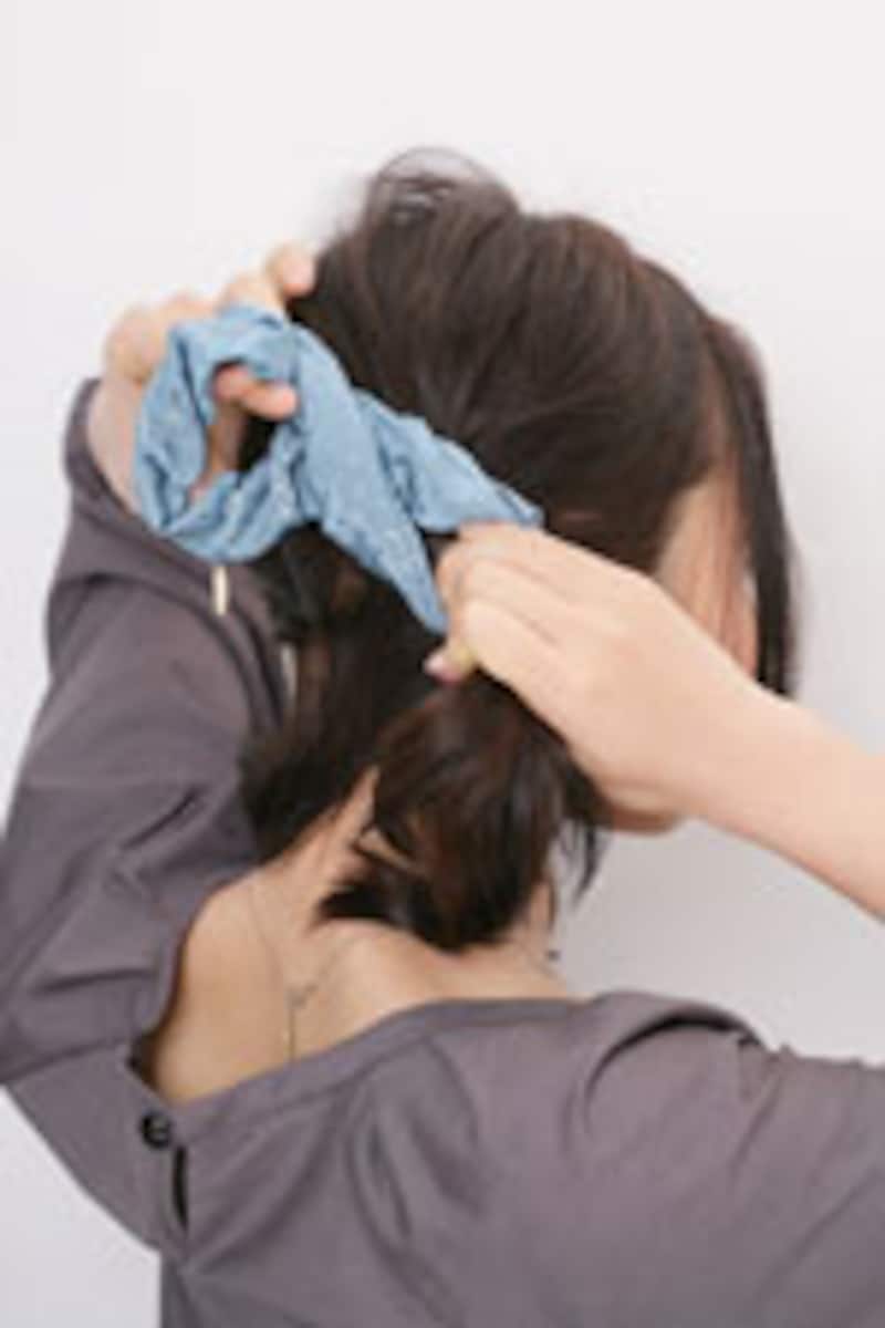 先ほどブロッキングした上の部分を耳の付け根あたりでシュシュを使って結わきます。ブロッキングの下の部分はそのまま自然におろしておくだけでOK!