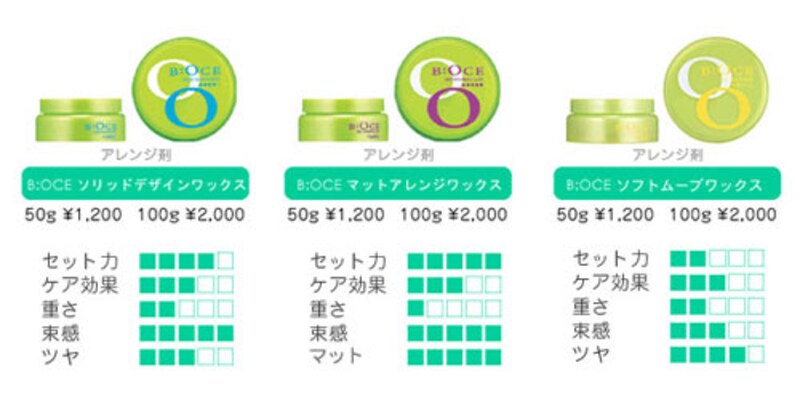動きのあるスタイリングがお好きな方にピッタリなこの3タイプ。艶感のあるものからマットな質感のものまで幅広くラインナップがあるので自分の好きな質感を毎日変えてスタイリングができますね。