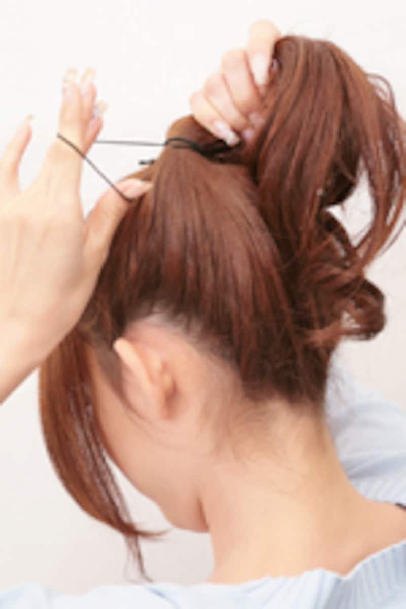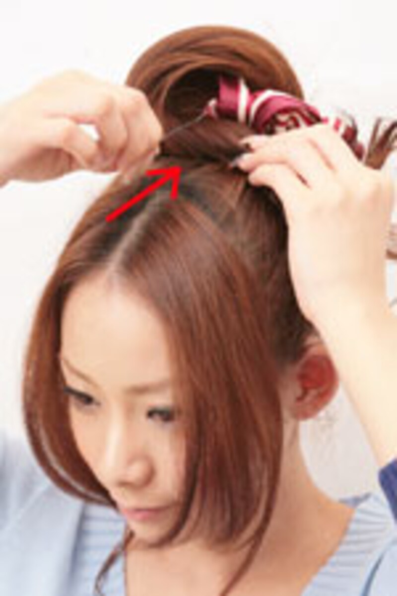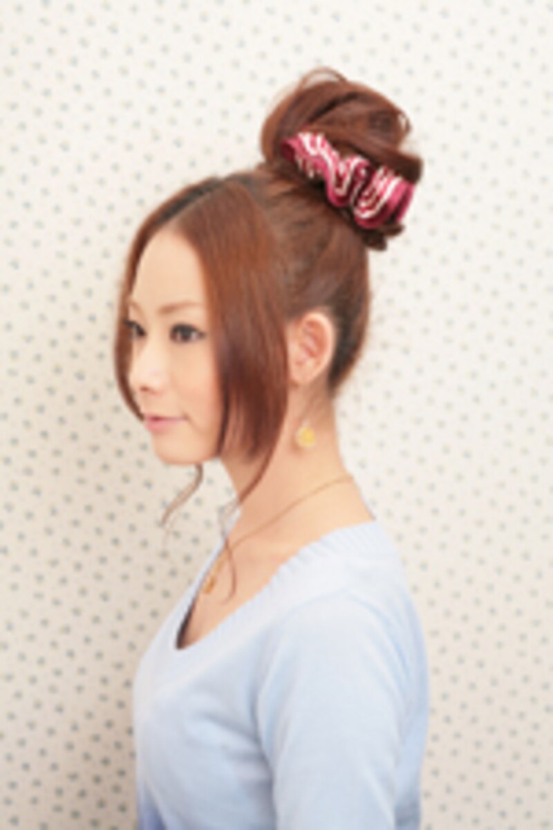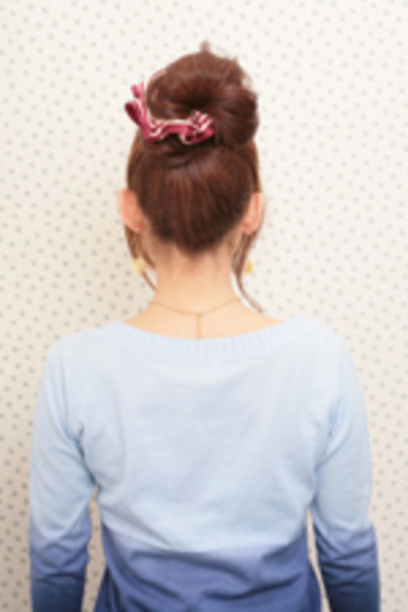 ルーズさを出すためにゆるくねじり、お団子とシュシュが見えるバランスを上手に整えましょう。