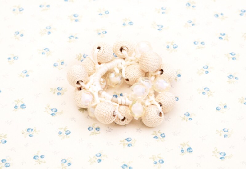 | ニットボールゴム\1,365(プランタン銀座 本館B1Fアクセソワール)、パール付ニット\5,040(PROPORTION BODY DDRESSING)、ピアス\1,155(シャンデリーク/マルイプレスルーム) hairmake:青木佳子/GARDEN |