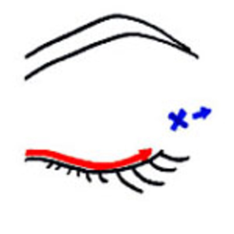 【1】まずは目尻からスタート。いきなり目頭から描きはじめると、イキオイ余って目尻部分では基本ラインからそれてしまうことが。トメの部分である目尻のラインからはじめましょう。図の×印にライナーを持っていないほうの指を当て、青い矢印の方向に少し引っ張るようにするのがコツ。まぶたを閉じ気味にして、目尻からまぶた中央に向けてゆっくり描いて。(図赤矢印参照)