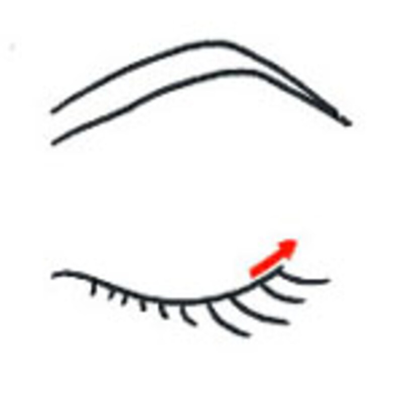 【3】目尻部分は力を抜いて仕上げ。大まかなラインが完成したら、ライナーを少し下からあてるようにして、まつげの隙間を埋めていきます。目尻部分は無理にハネ上げず、筆先に残った液で、外側にスーッと5ミリ程度のばして(右図)。腕の力を抜くのがポイント。
