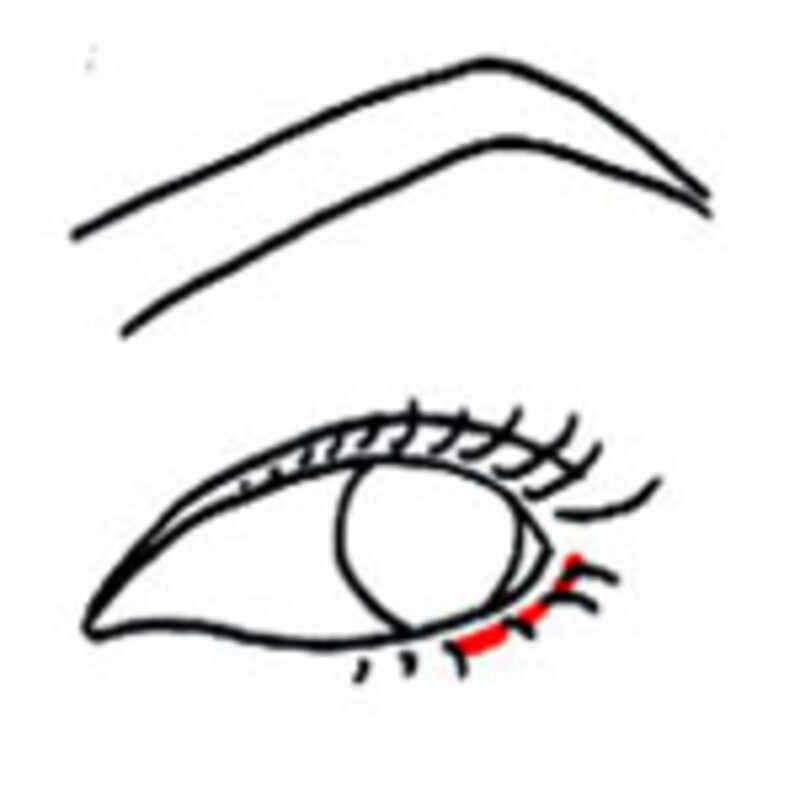 【4】下まぶたにシャドウを入れてバランスを。上まぶたのラインの迫力とバランスをとるために、仕上げに下まぶたの目尻側1/3程度(左図の赤い部分)に細くシャドウを入れれば完成。
