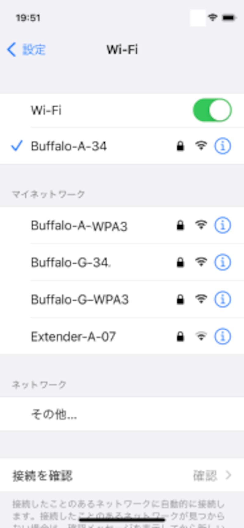 解決方法は、5GHz帯を利用しているときは、2.4GHz帯に切り替えてみることです。具体的には、「設定」→「Wi-Fi」を選択し「マイネットワーク」に表示されるSSID一覧で「~A~」が選択されていれば5GHz帯ですから、「~G~」の付いている2.4GHz帯のSSIDに切り替えます。