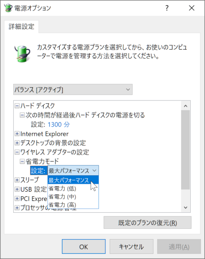 対処方法は、Windowsの「設定」→「設定の検索」ボックスに「電源プランの編集」と入力→「詳細な電源設定の変更」→「ワイヤレスアダプタの設定」→「省電力モード」→「設定」で「最大パフォーマンス」を選択してください。 ・デバイスマネージャーが古い