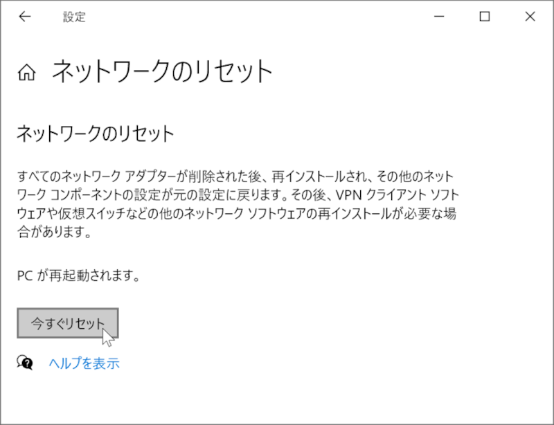 Windows 10での手順は、Windowsキー+X→「ネットワーク接続」→「状態」→「ネットワークの詳細設定」項目の中の「ネットワークのリセット」→「今すぐリセット」を選択します。