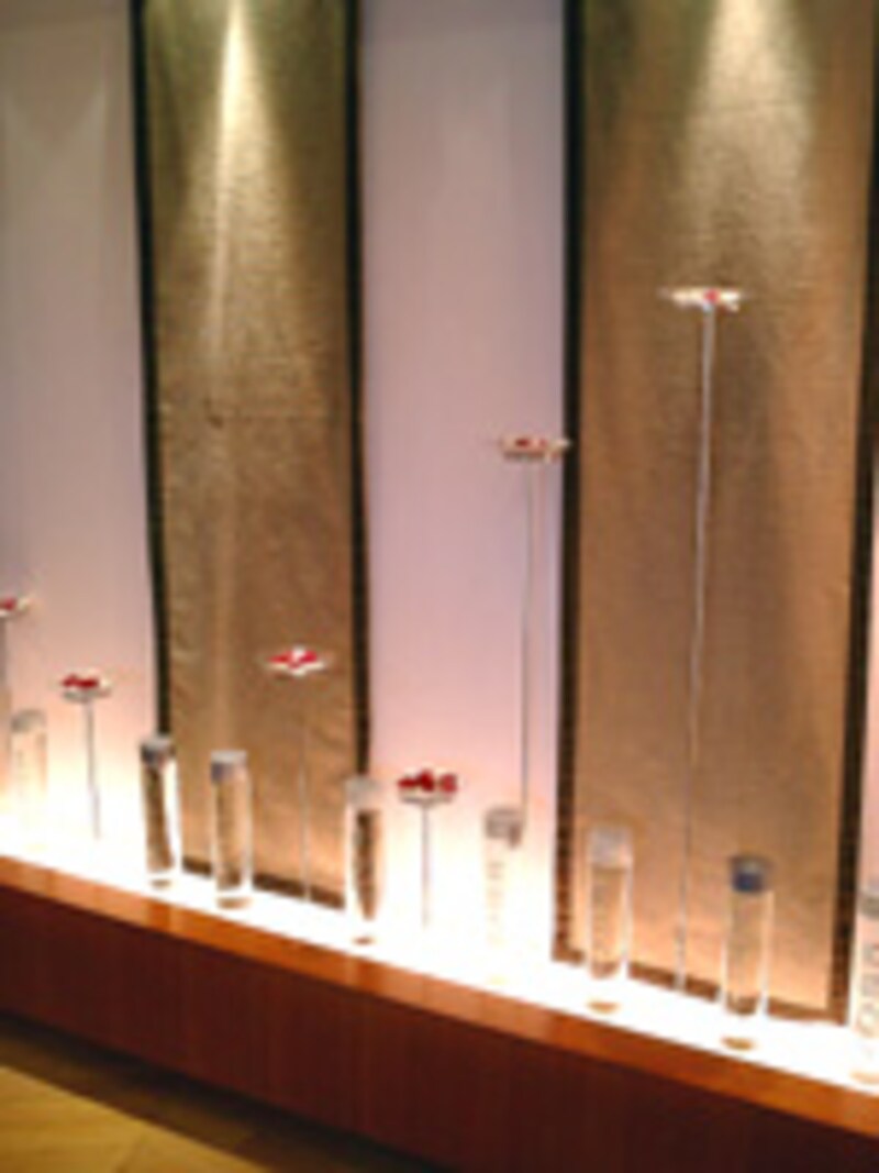 フロント横の通路を通って、バーデ棟へ早速移動。今日は、このバーデ棟2階にあるエステティックサロン『アクアボーテスパ』で、ボディーのコースでは比較的人気だという「アロマフルボディートリートメント」(100分/18,900円)を受けた。このスパに入るとお水のラインナップがフロント周りにあるのに目が止まる。世界中のお水が並べられているのだ。