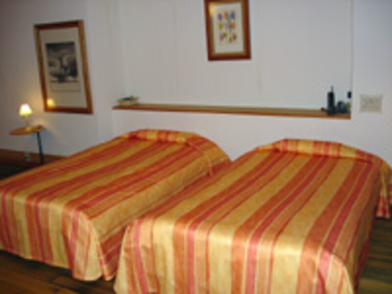 | 地中海にある旅籠屋をイメージしたという客室はすべてメゾネットタイプ。1Fにはテーブル&チェア4脚に、ベッド2台。 |