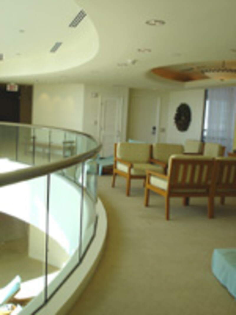 | リラクゼーションスペース。吹き抜けの下はフロント |