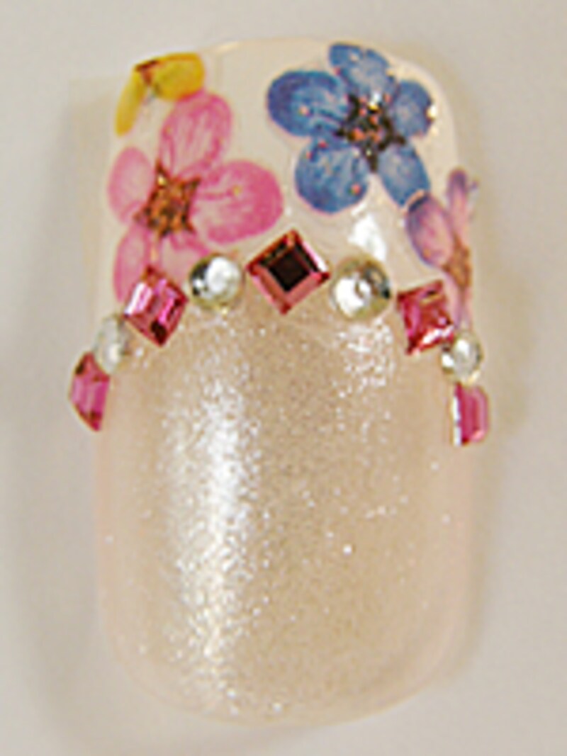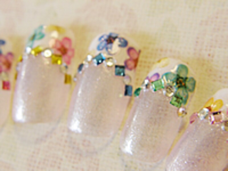6. フレンチラインに沿ってストーンを配置します。今回はスクエア型とラウンド型のアクリルストーンを交互に置いてラインを作ります。 【使用ストーン】 ビューティーネイラー各種(販売元:株式会社ムラキ) 7.スクエア型のストーンをひし形に見えるように回転させて使うのがポイント! 押し花ネイルアートの完成です! カラフルでキュートなフレンチアレンジは押し花シールでトライ! 押し花シールはこの他にもカラーバリエーションがあります。お好きな組み合わせでカラフルなネイルアートを楽しみましょう! 【関連記事】 ・愛されダブルフレンチ勝負! ・春風誘うフレンチネイルアレンジに挑戦! ・フレンチネイルは基本が勝負!【編集部おすすめの購入サイト】Amazonでネイルグッズをチェック!楽天市場でネイルアート用品をチェック!前のページへ12※記事内容は執筆時点のものです。最新の内容をご確認ください。※個人の体質、また、誤った方法による実践に起因して肌荒れや不調を引き起こす場合があります。実践の際には、必ず自身の体質及び健康状態を十分に考慮し、正しい方法で行ってください。また、全ての方への有効性を保証するものではありません。