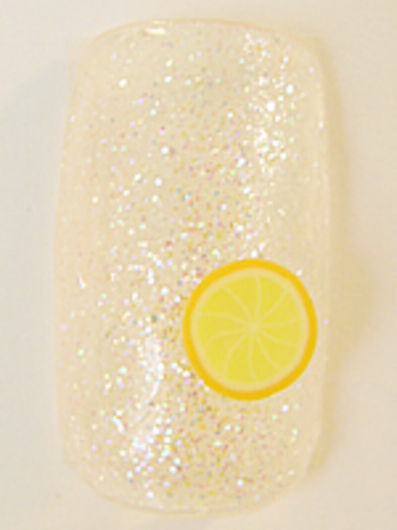 2. オレンジのスライスを1枚置きます。パーツが動いてしまい固定できない場合には、少量のトップコートを用いて固定させます。