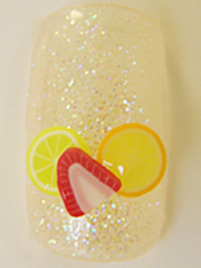 3. 続いてオレンジの隣にレモンのスライスを置いて、その中央に重なるようにしてイチゴを置きます。爪の幅のバランスを見ながら配置していきましょう。爪が小さめの方は乗せるフルーツの量を減らします。