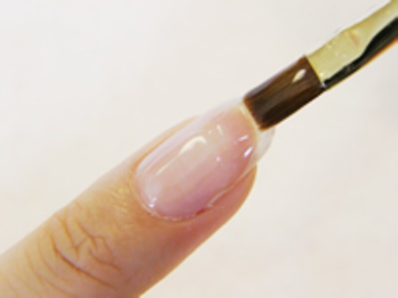 2. 爪にジェルを塗布します。甘皮周りにジェルが付かないように、爪周り1~2ミリ程度離すように塗りましょう。筆を軽く運ぶようにするのがコツです。