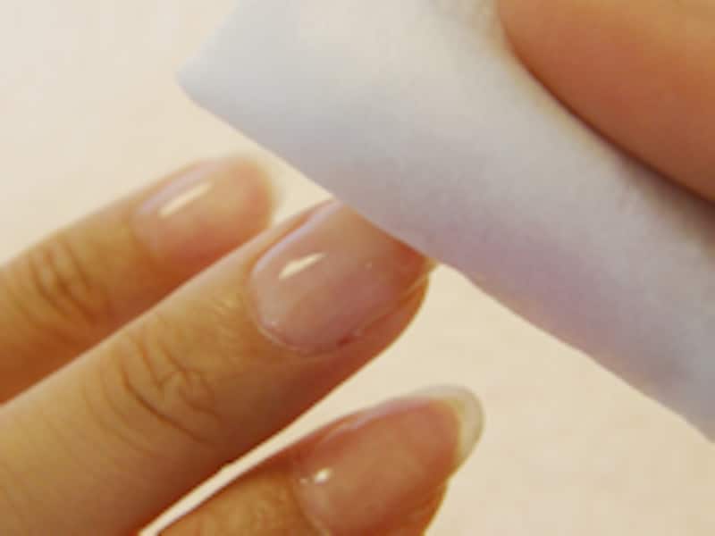 9. ライトから手を出して、ワイプやコットンに染み込ませたジェルクリーナーもしくはノンアセトンポリッシュリムーバーで爪の表面に残っている未硬化ジェルを拭き取ります。