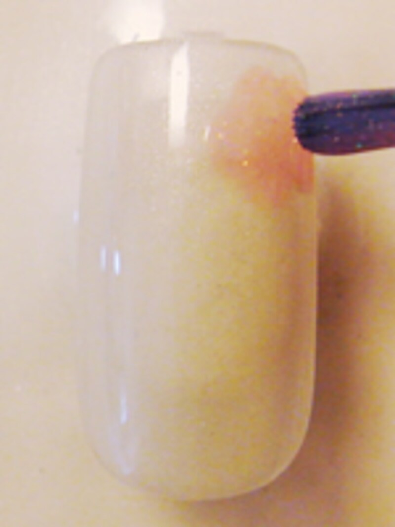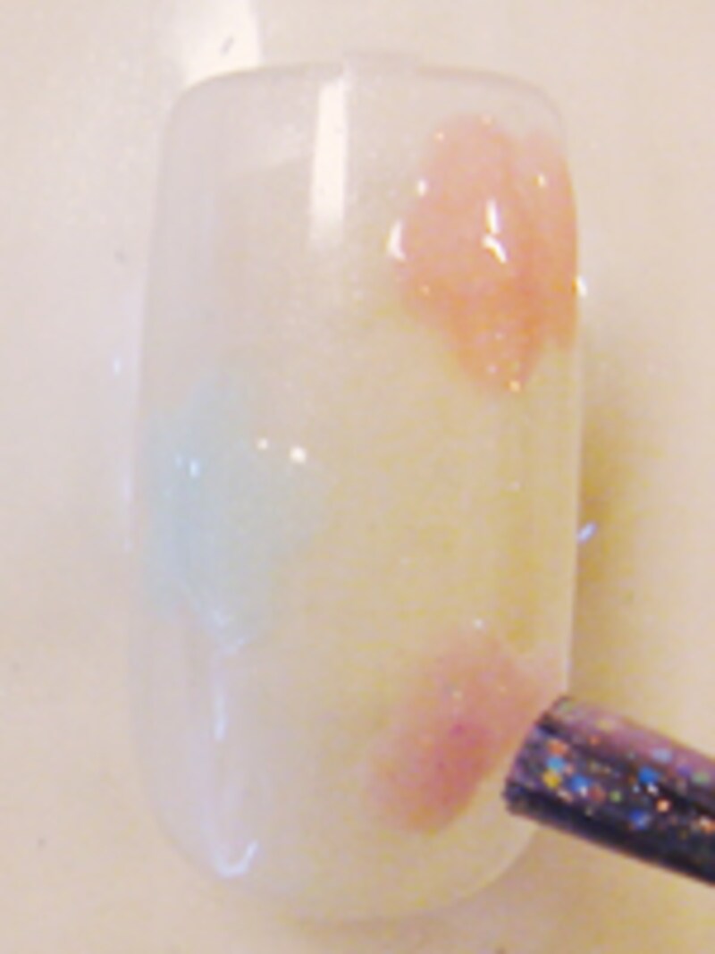 1. ベースカラーを1度塗りした後、カラーポリッシュでドットを落とすようにお花の形を作ります。