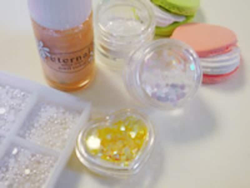 ネイルポリッシュは淡いオレンジのホログラムカラーをセレクト。ホログラムは六角とハート型を使ってかわいらしく仕上げ、マカロンによく似合うパールストーンを使います。