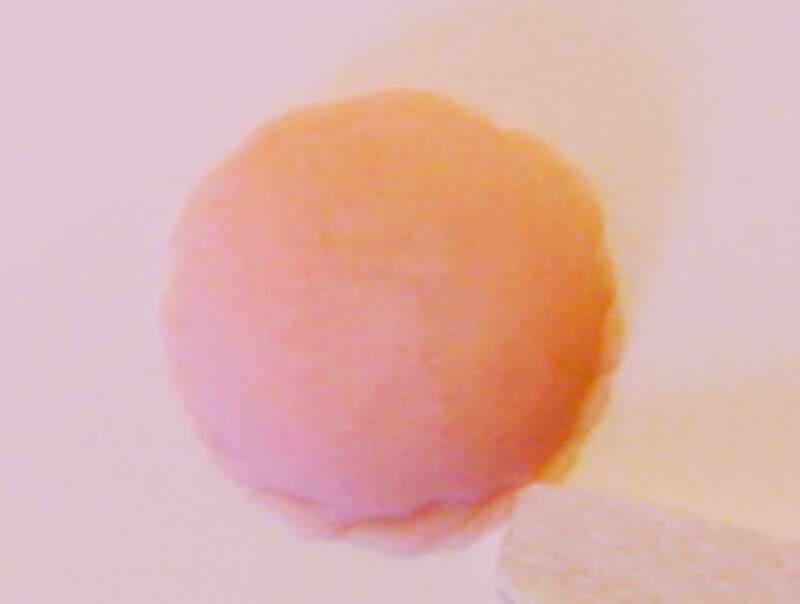 2. 筆にミクスチャーを取り、ペーパーパレットの上に置きます。ミクスチャーが自然と流れて程よい円形になるのを待ちます。パウダーとリキッドの割合が適量であれば、必ず画像のようにきれいな形になります。大きすぎてしまったら、筆を外側から中心に向かって小さく形を整えます。