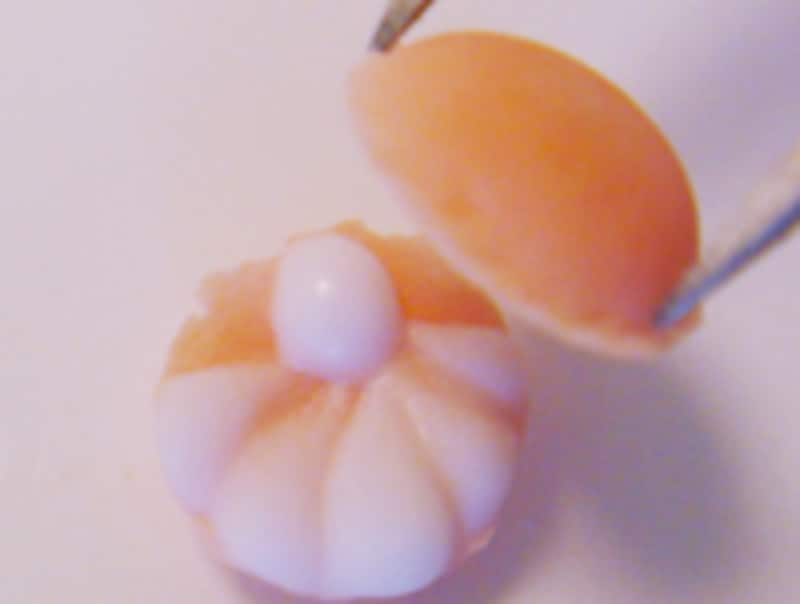 6.重なる花びらのイメージで形作り、最後に接着用にミクスチャーを1つ置きます。そのミクスチャーが固まる前に、あらかじめ作っておいたもう1つのマカロンで閉じます。